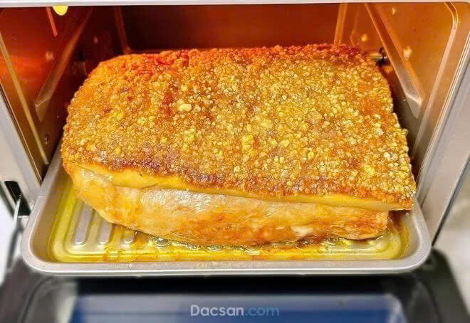 Thực hiện làm nóng lò 10 phút rồi cho khổ thịt vào. Cài đặt mức nhiệt 170 độ trong thời gian 25 phút.