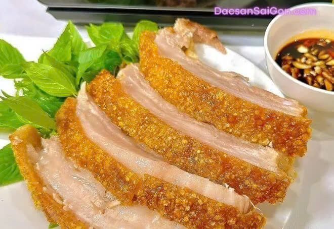 Món heo quay giòn bì này lúc nào cũng có một sự hấp dẫn rất riêng. Phần bì giòn rụm nhai rộp rộp trong miệng, thịt mềm thơm. Thưởng thức ngay lúc còn nóng, chấm với chút nước tương thôi đã ngon nhức nách rồi.